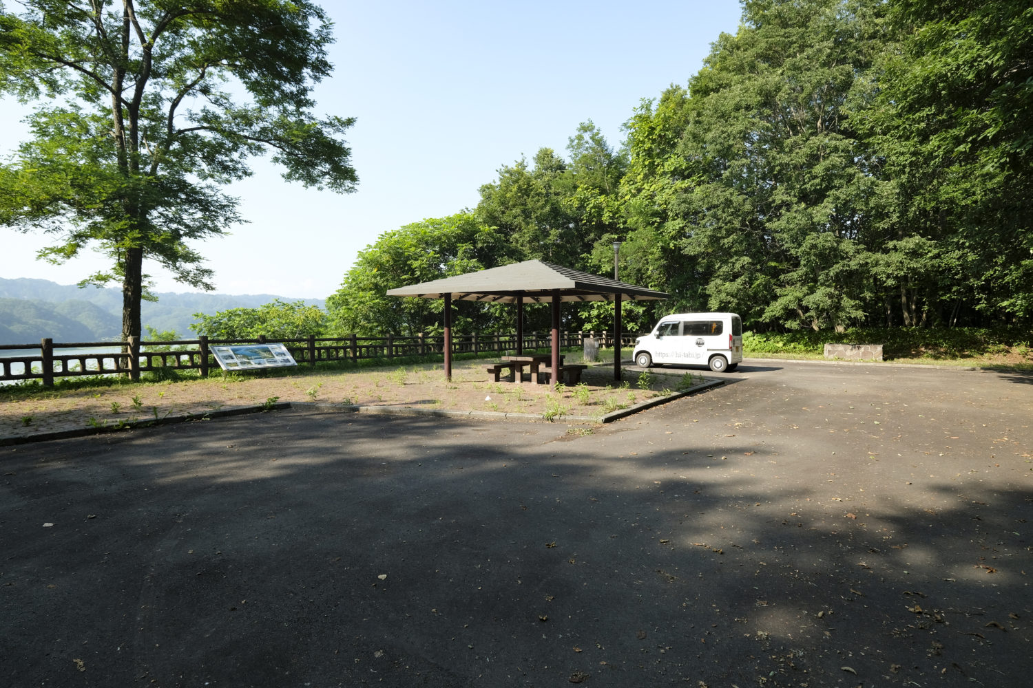 ダム左岸の展望台:右岸と違いクルマで登れる展望地ではあるものの、手前の樹木が邪魔で見えにくく、かつ遠目でパッとした展望は得られません。国道から1分ほどで登れるとはいえ時間のロスと言わざるを得ないでしょう。